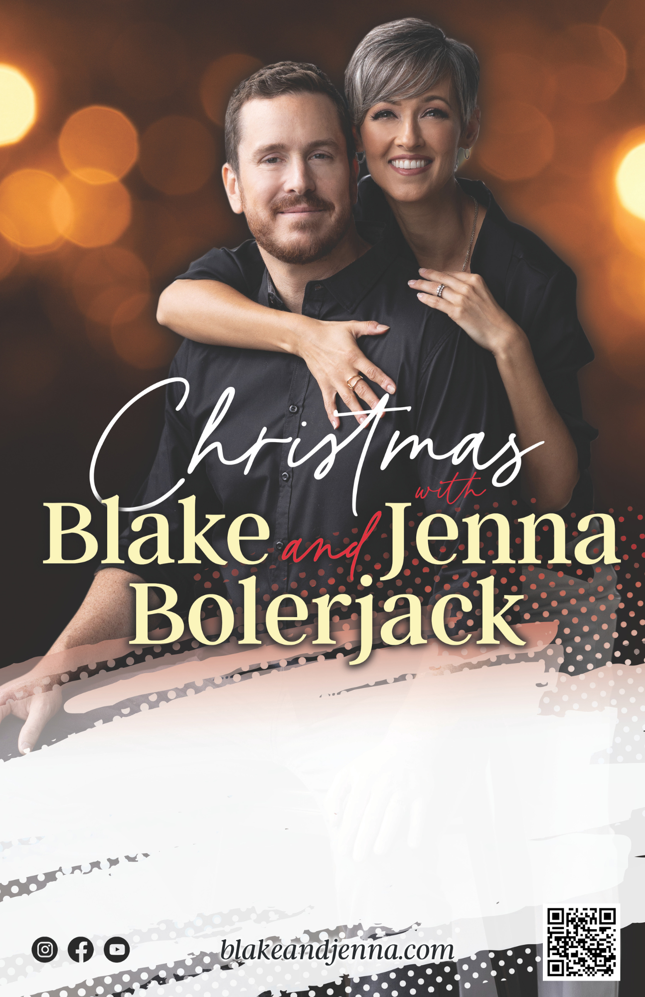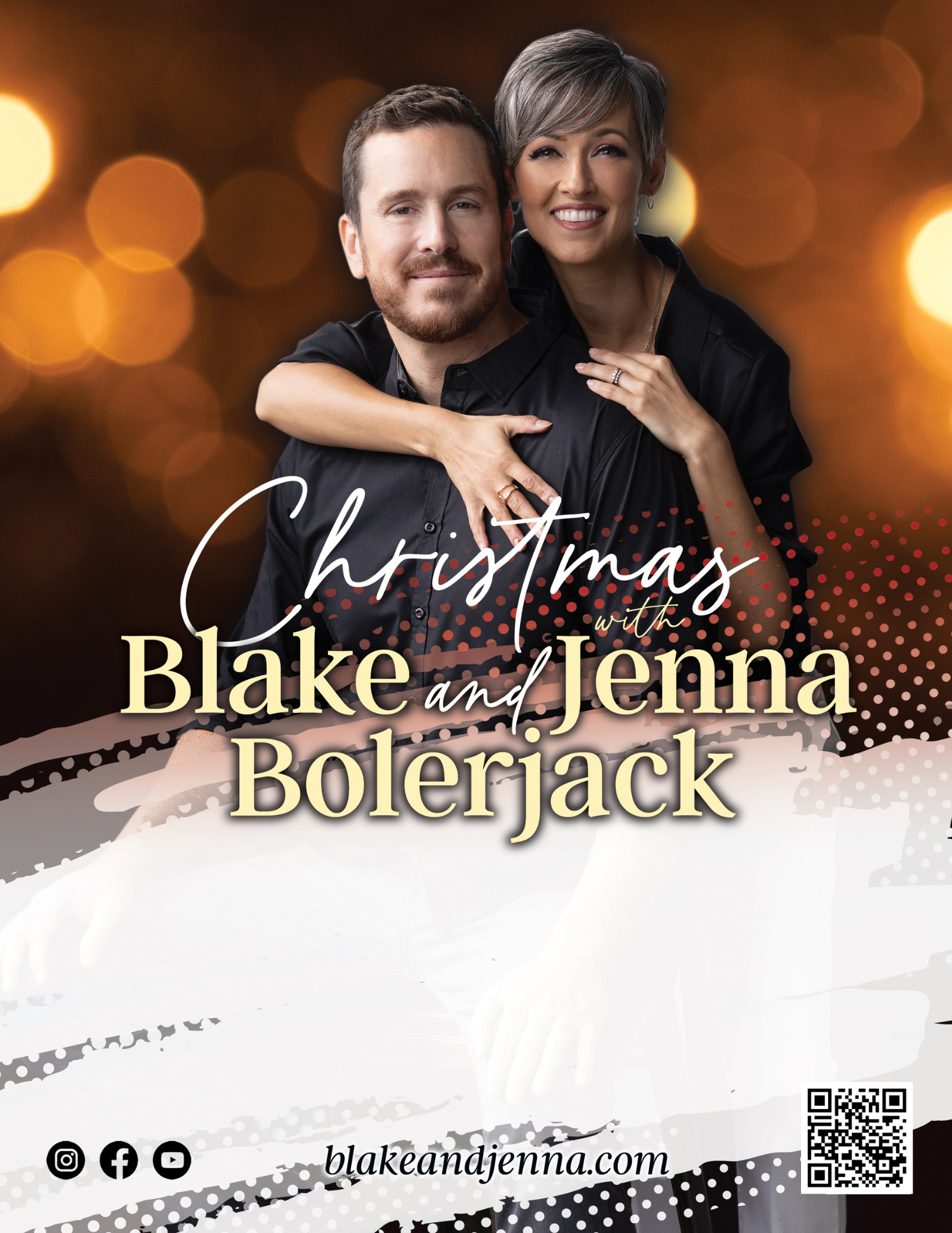 Award winning Christian Recording Artists Blake & Jenna Bolerjack will be coming this season LIVE for a Christmas Concert at VENUE, CITY/STATE, at TIME. Their concert will feature well known Christmas favorites and new songs: a fun, eclectic Holiday mix of Gospel, Pop, Southern Gospel and Classical selections. Listen Online to Blake & Jenna’s Christmas album “Christmas In the Snow” streaming on Spotify, Pandora, Amazon, and Apple Music. Find Blake & Jenna online at: https://linktr.ee/blakeandjenna or blakeandjenna.com